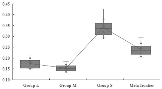Following [23], the technology-change effect under the group frontier can be measured by . Meanwhile, the technology-change effect under the meta-frontier can be measured by . Combining these two effects, the change in energy-use technology among the different types of economies can effectively reflect their heterogeneity in technology.