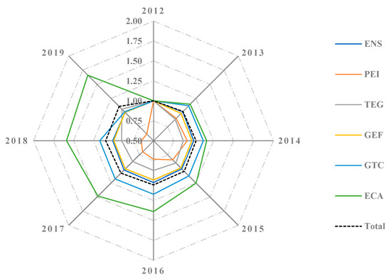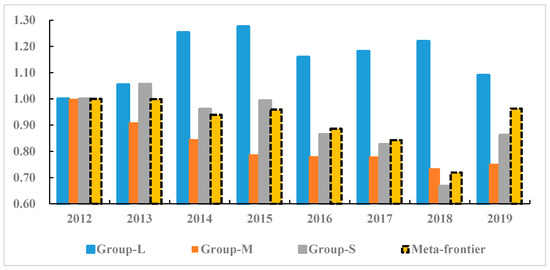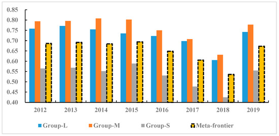 Time series changes in energy efficiency of the different groups during the period of 2012–2019.