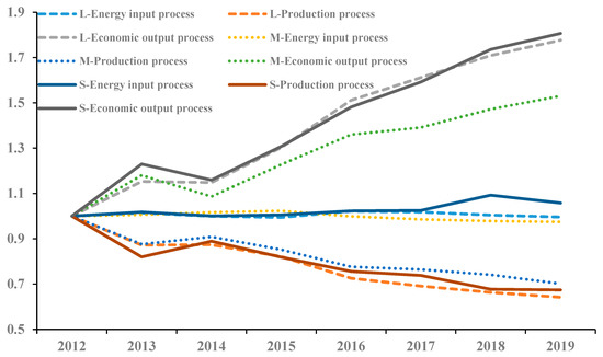 As shown in Figure 3, the energy efficiency of the sample countries decreased in a fluctuation manner and rebounded after reaching the lowest value in 2018. This is mainly because since 2017, the world economy witnessed a gradual improvement. Developed economies enjoyed a sound growth momentum, while emerging markets and developing economies neglected process optimization in order to acquire steady growth and recovery [34]. Taking Indonesia as an example, in addition to the relatively low management level, the industrial structure of high energy consumption has not been reasonably optimized, resulting in a 29% decline in energy efficiency. For the different types of countries, Group-M showed the best energy efficiency, followed by Group-L and Group-S. This is mainly due to the fact that Group-M was basically composed of developed countries that consume relatively less energy, having enough advantages (talent, management, and capital investment) to improve their energy efficiency [28,35].