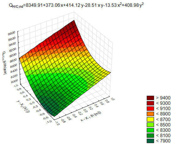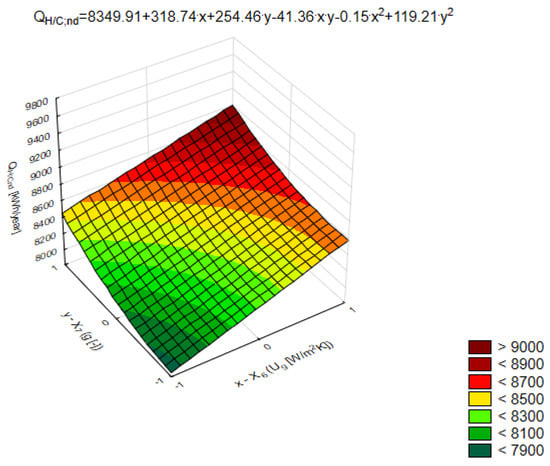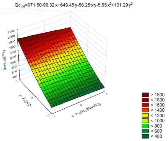 - It was established that, for the model of energy demand for heating, when changing from the lower to the upper level of factors k (X2), ρ2 (X4), d (X5), and g (X7), the value of heat demand for heating QH,nd decreases by −4.8%, −0.7%, −1.2%, and −10.1%, respectively. With a similar change in the value of the factors h (X1), ρ1 (X3), and Ug (X6), the amount QH,nd increases by +13.8%, +0.4%, and +11.6%. On the other hand, the energy demand for cooling QC,nd when increasing the value of factors h (X1), ρ1 (X3), ρ2 (X4), d (X5), and Ug (X6) decreases by about −20.8%, −7.7%, −1.1%, −5.1%, and −18.1%, respectively, but increases with the increase in the value of the factors k (X2) and g (X7) by +285.1% and + 306.8%, respectively.