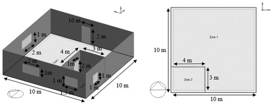 The aims and objectives of this paper are to quantify the effect of air conditioning (AC) temperature setpoint on the energy consumption and CO2 emissions of a generic ASHRAE-based residential building. The model studied herein has been developed in DesignBuilder using a set of essential parameters, including building layout, which is shown in Figure 1 [27,28]. In addition, the parameters include the building design specifications, which include the construction materials (to define insulation and predict heat transfer) [27,28], the HVAC systems [12,23], the lighting system [12,23], and the activity templets [12,23]). These parameters are specified in Table 1 and Table 2. Moreover, the weather data has been defined for Qatar [29]; see Figure 2. The DesignBuilder simulation software has been utilized herein to benchmark the effect of increasing the cooling setpoint temperature up to an additional 6 °C, with a step size of 0.5 °C, compared to a control case that follows the ASHRAE HVAC control criteria [12,23], see Table 1. The activity templates and occupancy schedules maintained control for all the cases of the study, as proposed by the ASHRAE criteria [12] and as defined in the DesignBuilder database (i.e., activity template: ASHRAE Residential Dwelling Unit and occupancy schedule: ASHRAE Residential Occ [23]). The HVAC configuration in this study has been defined as ‘split-no fresh air’ using the DesignBuilder database. The adopted building in this paper (in Figure 1) is a generic building that has been well-defined and reported in the literature [27,28]. The specifications of the building have been implemented in DesignBuilder, as shown in Table 2.