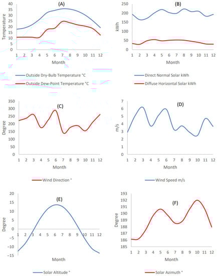 Site weather data (Doha-Qatar). (A) Outside dry-bulb and dew-point temperatures; (B) Direct normal and diffusive horizontal solar intensity; (C) Wind direction; (D) Wind speed; (E) Solar altitude; (F) Solar azimuth.
