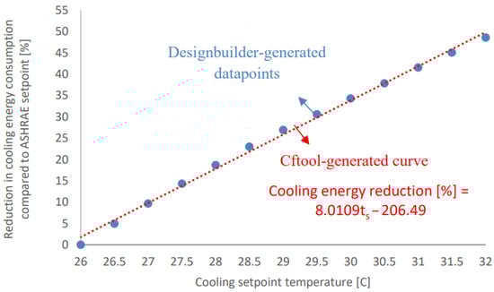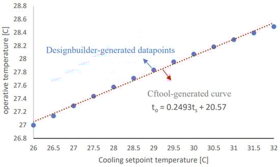 The cooling setpoint () defines “the ideal temperature in the space when cooling is required” (i.e., the setting of the cooling thermostat) [12,23]. On the other hand, operative temperature () can be defined as “the average of the mean radiant and ambient air temperatures, weighted by their respective heat transfer coefficients” [12,23]. Figure 3 correlates the average annual operative temperature to the cooling setpoint temperature within the interval of [26–32 °C] with a step size of 0.5 °C. As shown in Figure 3, the DesignBuilder-generated data points have been curve-fitted using cftool-MATLAB into a polynomial correlation. To quantify the sensitivity of the operative temperature toward the cooling setpoint temperature, the first derivative of the second-order correlation has been utilized. The sensitivity of the operative temperature towards the cooling setpoint temperature within the tested interval ( has been found to be approximately 0.25. This essentially means that increasing the cooling setpoint temperature by 1 °C would only increase the operative temperature by approximately 0.25 °C.