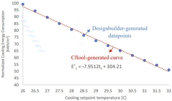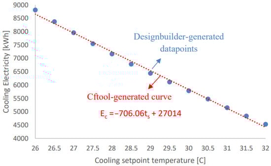 However, increasing the cooling setpoint temperature has a more significant impact on reducing energy consumption, as shown in Figure 4. In similarity to the adopted approach to quantify the sensitivity of towards , the DesignBuilder-generated data of the annual cooling energy consumption, with respect to the cooling temperature setpoint, have been curve-fitted using cftool-MATLAB, yielding a generic correlation that describes cooling energy consumption () as a function of the cooling setpoint temperature.