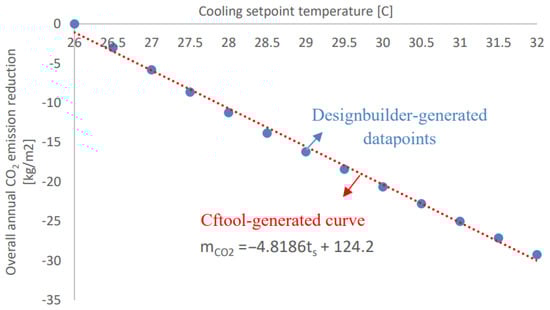 Figure 7 shows the potential reduction in annual CO2 emissions from increasing the cooling temperature setpoint when compared to the ASHRAE-based cooling setpoint (i.e., = 26 °C). The sensitivity of the annual reduced CO2 emissions () towards the increased cooling setpoint temperature compared to the ASHRAE-based cooling setpoint () was found to be approximately −4.8 kg CO2/m2 °C. Therefore, increasing the cooling setpoint temperature by 1 °C would reduce the annual CO2 emissions by 4.8 kg for each 1 m2 of the occupied area.