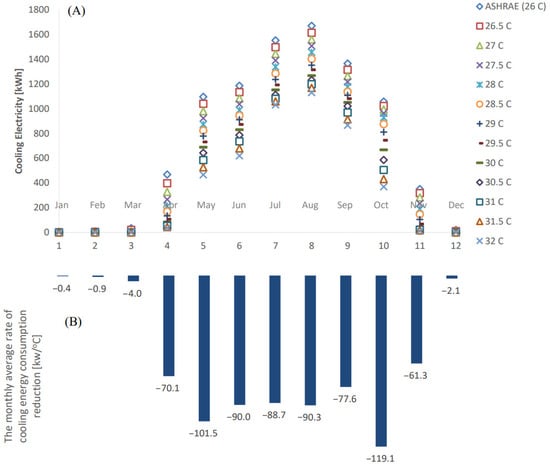 By plotting the monthly cooling energy consumption with respect to the cooling setpoint (Figure 8A), it was found that monthly cooling energy consumption is reduced approximately linearly as the cooling setpoint increases. The corresponding monthly average reductions in cooling energy consumption with respect to the cooling setpoint temperature increase () have been estimated for all months, as shown in Figure 8B.