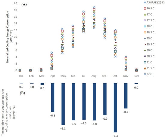 (A) The monthly normalized (by occupied area) cooling energy consumption with respect to the cooling setpoint; (B) The monthly average rate of normalized cooling energy consumption reduction with respect to the cooling setpoint temperature increase ().