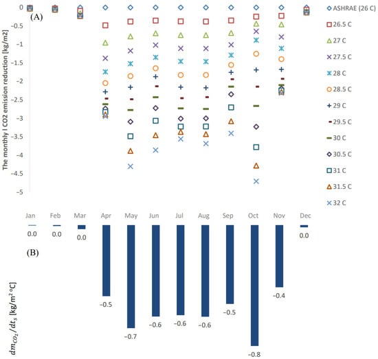 (A) The monthly amount of the reduced CO2 emissions by increasing from the ASHRAE-based cooling setpoint (26 °C); (B) The sensitivity of the monthly reduced CO2 emissions () towards the increased cooling setpoint temperature compared to the ASHRAE-based cooling setpoint ().