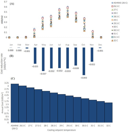This essentially means that, as shown in Figure 10B, the greatest opportunity to reduce cooling costs is by increasing the cooling setpoint temperature in October, with a reduction rate of 0.043 kW/m2 °C. In June, July, and August, the cost reduction rates were approximately equivalent at −0.032 kW/m2 °C, −0.032 kW/m2 °C, and −0.033 kW/m2 °C, respectively). In April, September, and November, the opportunity to reduce energy costs is less significant compared to the previously mentioned months (i.e., −0.025 kW/m2 °C, −0.028 kW/m2 °C, and −0.022 kW/m2 °C, respectively). Finally, the possible cost reduction rates in January, February, March, and December are negligible. Figure 11C shows the annual normalized cost of each cooling setup, and it can be concluded that increasing the cooling setpoint temperature by 1 °C has the effect of reducing annual energy costs by approximately 0.3 USD/m2, which accounts for an approximate 10 to 12% cost reduction.