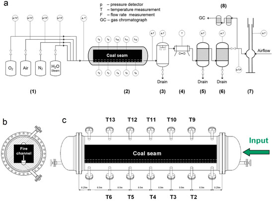 Reactor used in the experiment. (a) Scheme of the pressure unit for simulation of the underground coal gasification process, as follows: (1) compressed reagents, (2) pressure reactor, (3) wet scrubber, (4) air cooler, (5,6) gas cleaning system, (7) thermal combustor, (8) gas treatment module prior to GC analysis; (b) cross-section of the reactor, (c) longitudinal section of the reactor.