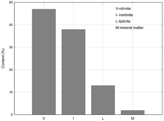 The share of macerals from the inertinite group was 38% (Figure 3). This group was represented by inertodethrinite semifusinite and micrinite, where micrinite and fusinite were found to be less common (Figure 4a–d).