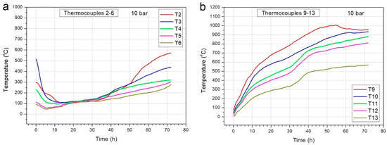 The highest recorded temperature at a distance of 0.75 m at a pressure of 10 bar was about 1000 °C in the top part and 580 °C in the bottom part (thermocouples T9 and T2, respectively). As the distance from the reactor chamber inlet increased, the values of the recorded temperatures decreased. At a distance of 1.75 m from the reactor chamber inlet, the highest recorded temperatures are 880 °C and 300 °C in the top and bottom parts, respectively (thermocouples T11 and T4, respectively). The highest temperature recorded by thermocouples T13 and T6, located 2.75 m from the reactor chamber inlet, was approximately 580 °C in the top part and 280 °C in the bottom part, respectively (Figure 5a and Figure 5b, respectively).