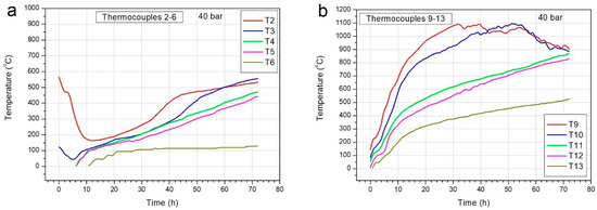 The temperature distribution in the reactor chamber during the coal gasification experiments at 10 and 40 bar pressures was analyzed. It was found that in both experiments the recorded temperature at the distances of 0.75 m (T9 and T2 thermocouples), 1.75 m (T11 and T4 thermocouples), and 2.75 m (T13 and T6 thermocouples) in the top and bottom parts, respectively, was different during the entire gasification process (Figure 5 and Figure 6).