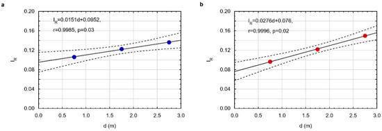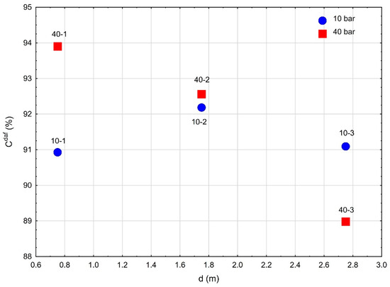The distance for which the value of IR = 1 means that the reflectance value of the gasification residue is equal to that of the raw sample. In the case of an experiment at a pressure of 10 bar, the estimated distance for which IR = 1 is approximately 60 m, while for a pressure of 40 bar it is approximately 35 m, assuming that the relationship IR = f (d) is linear.