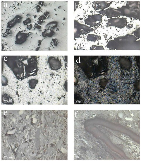 Vitrinite grains were found with visible pores after degassing (Figure 10a), while coke grains were also observed in these samples and were characterized by the presence of various pore sizes and a high relief (Figure 10b). There was also a mesophase, where, in some places, it formed regions of the same optical orientation anisotropic domains (Figure 10c,d).