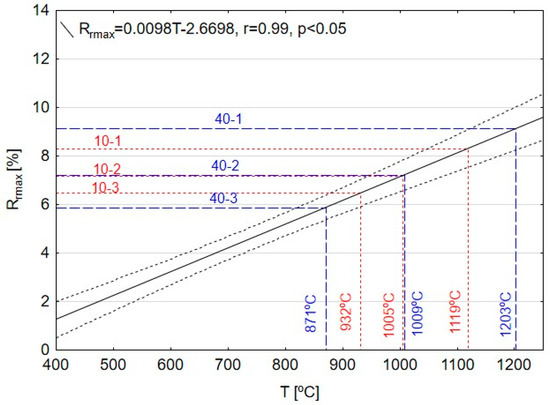 The values of true maximum reflectance gasification residue/vitrinite were compared with the data obtained for vitrinite subjected to thermal treatment in the laboratory experiments within the range of 400 °C to 1200 °C [37,39]. The arithmetic mean and standard deviation of the true maximum reflectance of vitrinite were calculated for each heat treatment temperature (i.e., 400, 500, 600, 800, 1000, and 1200 °C). The relationship between temperature and the mean value of the true maximum vitrinite reflectance Rmax = f(T) was then determined. This relationship was found to be linear and is given by Rrmax = 0.00982T-2.6698 (r = 0.99, p < 0.05; see Figure 11). This function was then used to obtain the temperature that acted on the coal during the experiment.