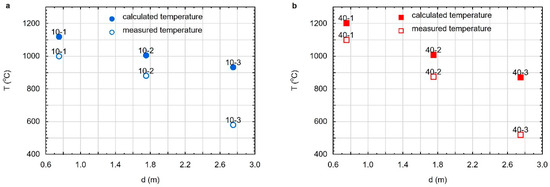 It was calculated that, at a distance of 0.75 m from the reactor chamber inlet during the experiment at 10 bar pressure (sample 10-1), the temperature reached a value of at least 1119 °C (Figure 11). Temperatures of about 1005 °C (sample 10-2, d = 1.75 m) and 932 °C (sample 10-3, d = 2.75 m) influenced the samples located further from the reactor chamber inlet. During the experiment at a pressure of 40 bar, the maximum temperature was 1203 °C (sample 40-1, d = 0.75 m). The samples located at a greater distance were influenced by temperatures of about 1009 °C (sample 40-2, d = 1.75 m) and 871 °C (sample 40-3, d = 2.75 m) (Figure 11). The results of this experiment show that with the increase in the distance from the reactor chamber inlet, the values of the temperature decrease, regardless of the pressure applied during the experiment (Figure 12a,b).