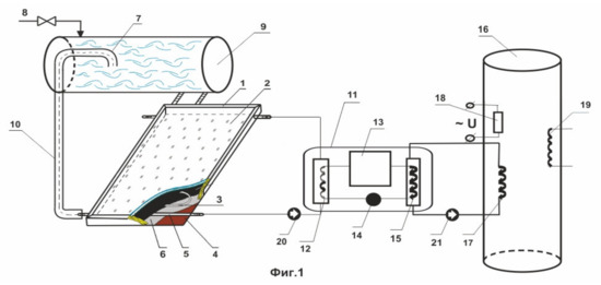 In the above figure, 1 is a flat solar collector; 2, a translucent insulating transparent double-glazed window; 3, a coil; 4, the bottom of a flat solar collector; 5, inlet and outlet pipes; 6, a heat insulating film; 7, a siphon dispenser tank; 8, a pipeline with a valve for cold water; 9, a dispenser tank; 10, a circulation pipe; 11, a heat pump; 12, an evaporator; 13, a compressor; 14, a valve; 15, a condenser; 16, a heat exchanger of the heating system; 17, an electric drive; 18, a backup electric heater; 19, a heat exchanger of the heating system; and 20 and 21, circulation pumps.