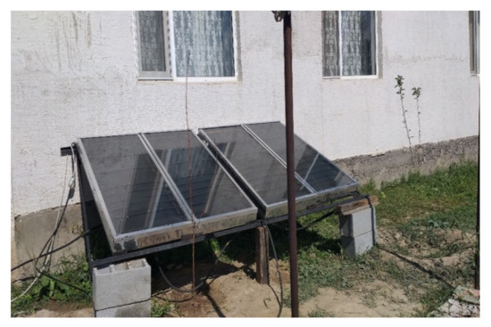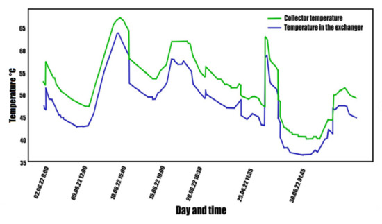 The tests were carried out at a water flow rate through the collector of 25 kg/(m2·h) and a water temperature at the inlet to the collector of 20, 30, 40, and 50 °C. The water temperature was changed from test to test. Thus, at least 4 tests were to be carried out. The duration of the tests was at least 2 h. Five thermocouples were connected to a data monitoring system that measured the temperature at various points within the system.