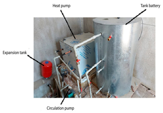 Figure 4 shows a thermal installation, which consists of an air-water heat pump, a circulation pump for circulating liquid through the system, as well as an expansion tank and a storage tank.