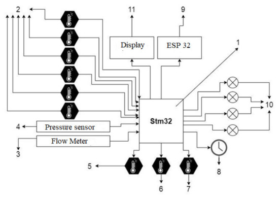 Figure 5. Block diagram for the control controller. (1) programmable logistics integrated circuit; (2) temperature sensor; (3) water flow sensor; (4) pressure sensor; (5) coolant temperature sensor in the heater tank; (6) coolant temperature sensor in the heat exchanger; (7) outdoor temperature sensor; (8) built-in software measuring device real-time; (9) ESP32 module; (10) four valves; (11) operation display.