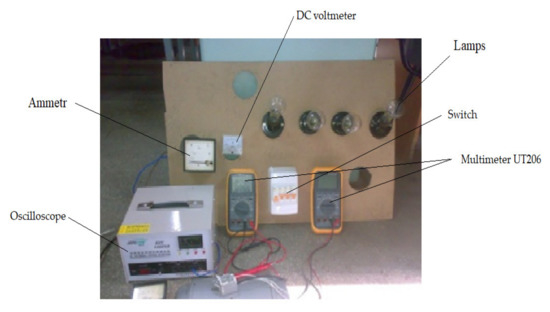 The experimental studies on a photovoltaics panel used an ammeter and a DC voltmeter, a multimeter UT206, an oscilloscope, and a switch.