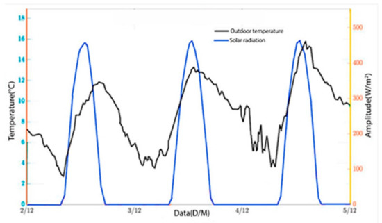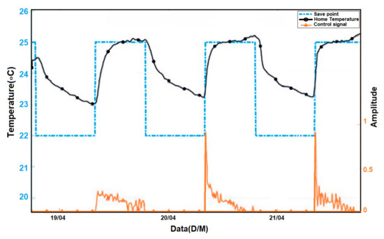 Figure 13 shows the change in room temperature during controller simulation. As one can see from this figure, the controller only works on the current room temperature to decide whether to turn the heating system on or off when the room temperature changes around the selected set point. In the controller, the input signals are extended to correct the last room temperature and the last applied control signal, taking into account external interference, namely the incident solar radiation and the ambient temperature.