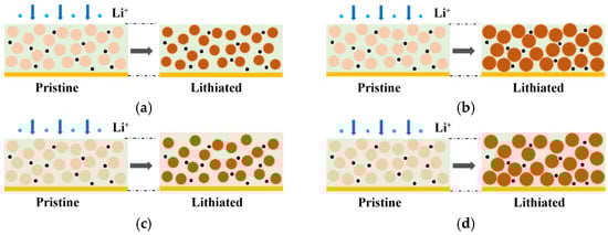 Schematics of electrode structures during lithiation with (a) no change in porosity and volume, (b) variable porosity and invariable volume, (c) variable volume and invariable porosity, and (d) variable porosity and volume.
