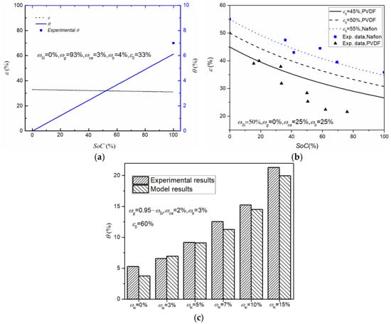 Here, ηca = ηb = 0 is used in Equation (15) due to there being no intercalation of Li into inactive materials. We can observe from Equations (15) and (16) that when the mass fraction and density of each solid component are determined, the real-time porosity is only dependent on the initial porosity and SoC. Based on the real-time porosity model, we can predict the evolution of the porosity caused by volume changes of the active materials and electrode dimensions during lithiation and then tailor the electrode parameters (e.g., mass fractions and initial porosity) according to the limitations on deformation and the real-time porosity. Furthermore, the real-time volumetric strain, θ, of composite electrodes can be expressed as: