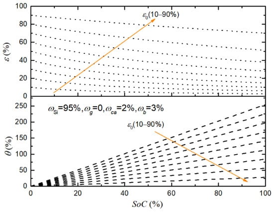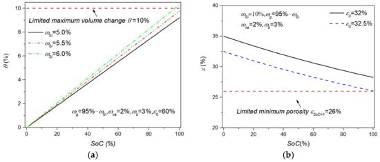 For electrodes with large-volume-change active materials, the initial porosity is a critical design index and is closely related to electrochemical performance due to its possible huge change in electrode structures during battery cycling. Figure 3 shows the evolution of the electrode’s porosity and volume change with SoC during lithiation for different initial porosities, obtained from Equations (15) and (17). As expected, the porosity has a descending trend during lithiation, and the volume change of electrodes increases with increasing SoC. The real-time porosity of Si-based electrodes with a single Si active material has a large change amplitude (e.g., 4–30%), which may result in significant fluctuations of electrochemical parameters and performance. In addition, the change in porosity obtained by the model is relatively more moderate in contrast to the case that limits the swelling of the Si-based electrode dimension [], as in our model the electrode deforms its dimension without extra restrictions. For changes in electrode dimensions and porosity originating from the microscopic deformation of active particles, we can observe from Figure 3 that the former generally accounts for a larger fraction than the latter; that is, the volume change in electrode dimensions is more noticeable than the change in porosity, indicating that allowing electrodes to expand freely alleviates the huge variation in porosity and the relevant mechanical stress inside the electrode. For example, for Si-based electrodes with ωSi = 10%, ωca = 10%, ωb= 10%, ρca = 1.6 g cm−3, ρb = 1.76 g cm−3, and ε0 = 52% [], the predicted porosity reduction of ~11% and volume expansion of ~29% are comparable with the measured values of 8% and 35%, respectively. However, it is inevitable for Si-based electrodes to suffer constraints imposed by the other battery parts in battery assembly. Furthermore, the large deformation of electrodes requires the corresponding reserved space during the manufacturing process, which damages the accessible energy density of the batteries. In addition, the increasing room provided by the larger initial porosity can better accommodate the volume change of Si particles, causing a decrease in the volume change of electrode dimensions. Therefore, it is necessary to tailor the initial porosity according to the permitted limit of volume change of the electrodes.
