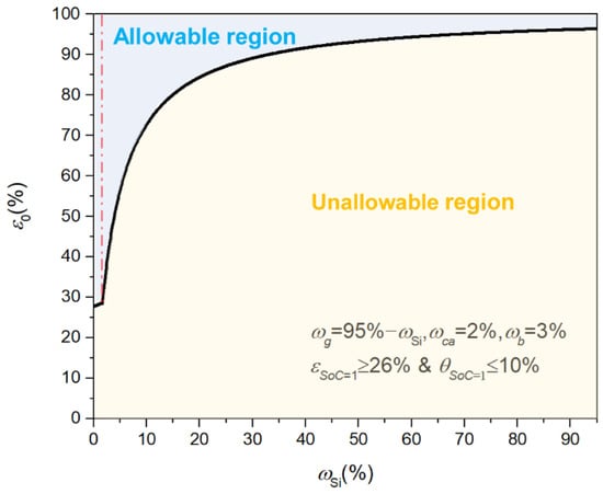 As mentioned above, the initial porosity and the mass fraction of the Si component should be flexibly designed based on the limits of maximum volume change and minimum porosity at SoC = 1. Here, the maximum volume change and the minimum porosity of Si-based anodes are set to 10% and 26%, respectively. The governing inequality constraints are provided by: