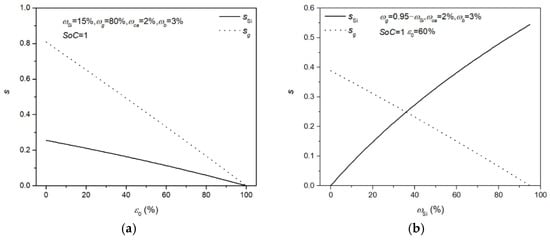 The aforementioned swelling coefficient is hard to determine. Here, the swelling coefficients of Si and graphite at SoC = 1 are shown in Figure 7 as the initial porosity or the mass fraction of Si varies. The contributions of volume changes in Si and graphite particles to the change in electrode dimensions decrease with increasing ε0 due to more accommodation space inside the electrode. For an electrode with high initial porosity, the greater room generated by the porosity accommodates the volume change of active materials, leading to a small s. Similarly, for a dense electrode with low initial porosity, less room is available to accommodate the volume change of the particles, and the change in electrode dimensions is dominant (i.e., a large s). These features of the swelling coefficient are consistent with the discussions conducted by Gomadam and Weidner []. Additionally, the swelling coefficient of Si increases with increasing ωSi, and the swelling coefficient of graphite decreases with increasing ωSi. Regardless, the swelling coefficient relies on a variety of conditions in the Si-based electrodes. In this work, the effects of the porosity and Si/graphite ratios on the swelling coefficient have been considered, ignoring the effects of the arrangement of particles, mechanical properties of the components, and constraints from other parts of the battery.