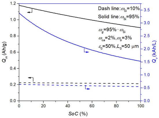 The variable porosity and electrode dimensions during lithiation and delithiation can have significant impacts on the estimation of electrode performance (i.e., gravimetric and volumetric capacities) that can be investigated based on Equations (28) and (29). Figure 8 shows the evolution of the gravimetric and volumetric capacities of Si-based composites during lithiation. The gravimetric and volumetric capacities are kept almost unchanged for low mass fractions of Si due to there being almost no changes in electrode structures, suggesting that the capacity calculated at SoC = 0 can be used to characterize the real-time capacity. In other words, the effects of variable porosity and electrode dimensions on capacity are negligible for electrodes with low mass fractions of the Si component, e.g., ωSi ≤ 10%. However, the gravimetric and volumetric capacities distinctly decrease with increasing SoC during lithiation for electrodes with high mass fractions of Si (e.g., 95%), indicating that the estimation of capacities for Si-based electrodes, especially those with high ωSi, should take into account the effects of changes in electrode structures, i.e., the real-time porosity and electrode dimensions in this work. It is worth noting that the effects of changes in porosity and electrode dimensions on specific capacity are rarely investigated or emphasized in the reported studies. For example, the capacities are often estimated based on the initial electrode parameters of Si-based electrodes, making them independent of SoC [,]. The model in this work, on the other hand, highlights the prominent role of volume change in the estimation of electrode electrochemical performance.