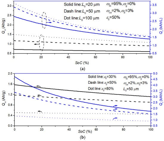 To further estimate the effects of different electrode parameters on the capacities, electrodes with different thicknesses or initial porosities are investigated, as shown in Figure 9. Apparently, both capacities reduce with increasing SoC for different cases, showing the important impacts of changes in electrode structures. Additionally, the change amplitude of the volumetric capacity is larger than that of the gravimetric capacity for different thicknesses and initial porosities, as the former is dominated by the prominent volume change of the electrode. As expected, the gravimetric and volumetric capacities decrease with decreasing electrode thickness and increasing initial porosity, showing that developing electrodes with high thickness and low porosity is an efficient solution for high-capacity LIBs. In light of the challenges of poor rate performance and electrode mechanical instability [,,], it is necessary to tailor the electrode thickness and the initial porosity for high-energy Si-based electrodes while considering the effects of electrode structure on the estimation of the gravimetric and volumetric capacities.