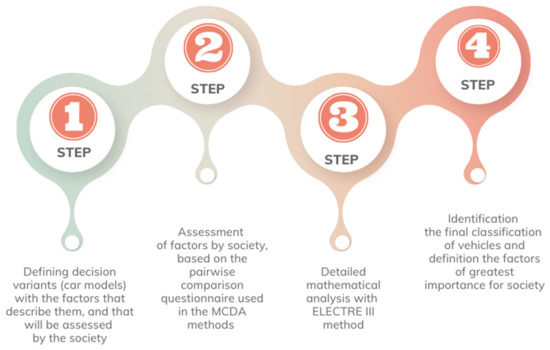 To obtain an answer as to what types of vehicles should be used in car-sharing vehicle fleets from the point of view of people currently not using the systems, a four-stage algorithm based on the next steps in the ELECTRE III method was proposed, which is presented in Figure 1.