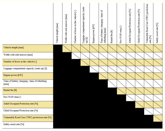 The second step was related to determining the importance of the individual factors describing vehicles (decision variants) for people who have not yet used car-sharing services. For this purpose, a research survey was carried out. It is worth mentioning that this was not a typical social survey, however, but rather a questionnaire of comparisons in pairs, where the public assessed each of the pairs of factors characterizing the vehicles. For each pair of factors, respondents were assigned a rating accordingly. Ratings were valued from 1 to 9 according to the scale used in the multi-criteria decision support methods, i.e., Saaty’s scale [46]. The characteristics of the ratings according to Saaty’s scale were as follows: