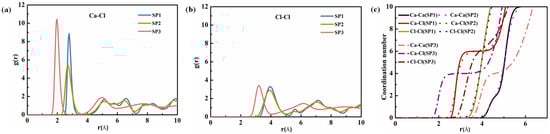 Density is the macroscopic reflection of molten salt microstructure. In this paper, three sets of parameters are analyzed from the perspective of physical properties by calculating the density change of CaCl2 with temperature in the molten state. Figure 2a shows the comparison of densities calculated by three sets of parameters with experimental values. The results show that the error between the calculated values of SP1 and SP2 and the experimental values [28] is less than 3%, and the error of SP3 is 5%. It can be seen from the density simulation results that the parameters SP1 and SP2 are reasonable.