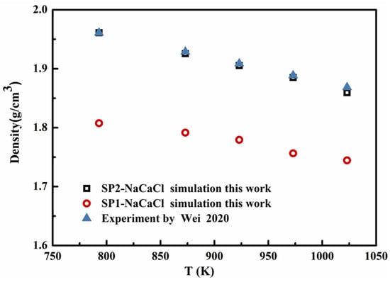 To further determine the applicability of CaCl2 potential parameters, SP1 and SP2 were used to calculate the density of binary eutectic molten salt of 49.03 mol % NaCl-50.97 mol % CaCl2. Because the potential parameter of NaCl [6] can well predict the high-temperature thermophysical properties and structural changes of chloride molten salt, the literature data of NaCl is directly selected. The simulated and experimental results are compared in Figure 3. Figure 3 shows that the simulated values of SP2 are basically consistent with the experimental values [4,29], and the error is within 0.5%, while the error of SP1 is within 8%. Probably because SP1 is the earliest simple potential energy model, the mixing rule is not suitable. Therefore, for the density calculation of binary NaCl-CaCl2 eutectic molten salt, SP2 is more suitable as the BMH potential parameter of CaCl2.