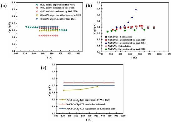 Specific heat capacities of chloride eutectic molten salts of (a) binary NaCl-CaCl2, (b) ternary NaCl-CaCl2-MgCl2 and (c) NaCl-CaCl2-KCl vs. temperature [4,5,30,31,32].