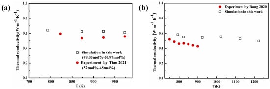 Thermal conductivity is an important index to characterize the heat transfer performance of molten salt materials. By comparing the existing experimental data, it is verified that SP2 can be used to predict the thermal conductivity of multicomponent chlorides molten salt. Figure 6 is the thermal conductivity simulated results of binary and ternary molten salts based on SP2 simulation. The simulated proportion of NaCl-CaCl2 (49.03–50.97 mol %) shown in Figure 6a is slightly different from that of the experiment [5], but all belong to the proportion of eutectic molten salt, and the deviation of thermal conductivity simulation is ~16.9%. Figure 6b shows that the simulated results of NaCl-CaCl2-MgCl2 (53.5–15–31.5 mol %) are also larger than the experimental values [9], but the trend with temperature is consistent. It can be seen from the simulated results that there is a negative correlation between thermal conductivity and temperature, indicating that the simulated thermal conductivity is reasonable.