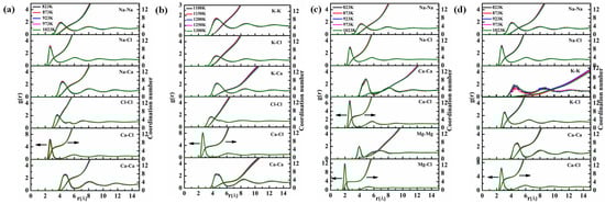 Radial distribution function (RDF) and coordination number curves of different chloride eutectic molten salts (a) NaCl-CaCl2, (b) KCl-CaCl2, (c) NaCl-CaCl2-MgCl2 and (d) NaCl-CaCl2-KCl.
