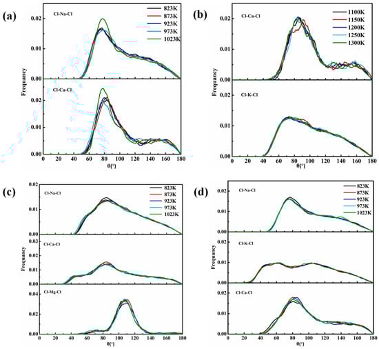 Bond angle distribution of different chloride eutectic molten salts (a) NaCl-CaCl2, (b) KCl-CaCl2, (c) NaCl-CaCl2-MgCl2 and (d) NaCl-CaCl2-KCl.