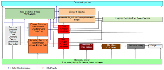 Step 3: Replacing coal and coke with biomass. Coal and energy derived from combustion of fossil fuels is the biggest emitter of CO2 emissions [2] and replacing coal with biomass in steel production would quite easily achieve a 30% reduction in carbon emissions, which is the reason why renewable energy technologies and replacing coal and coke with biomass are cornerstones in the Bio Steel Cycle. Replacing pre-combustion fossil fuels with biomass [6,7,8,9,35,59,67,95] and operating (green) hydrogen direct reduction (HDR) as well as capturing post-combustion CO2 emissions with the Geomimetic® process [91] are efforts which have the potential to reduce the CO2 emissions in steel production to almost “0”. There is considerable outreach into other industries, such as the application of the Geomimetic® [91] process, which produces aggregates from CO2 emissions and recycled concrete to producing new concrete and utilisation of BOF slacks for road building.