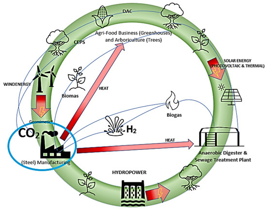 The most likely scenarios were considered, and the principles of the Bio Steel Cycle model are applicable to most heavy industries, such as cement, chemical, glass, paper, and transport. It includes using renewable energy technologies, avoiding CO2 emissions by incorporating process improvement technologies, recycling waste and by-products, and capturing post-combustion emissions where possible [14,15,25,26,35,59,60], as displayed in Figure 2: