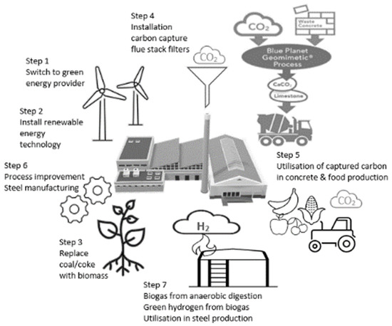 Renewable energy technologies as one of the key components within the Bio Steel Cycle, can reduce CO2 emissions in steelmaking by more than 30% [81] if commercial entities in iron and steel production [25,26,82] were to simply switch their energy providers [59] to those who are deriving their energy based on 100% renewable energy technology. Retrofitting existing plants to produce their own energy (wind, solar, PV) is the next logical step. The same applies to greenhouses, as there is a vast amount of roof space available, which has to date not been utilised. The static requirements would obviously have to be considered, but as the cost of solar energy and solar PV has decreased significantly over recent years [92] to less than GBP3/m2, it can be considered an unmissable opportunity. Figure 4 demonstrates the steps, built on the components within the BiSC, that should be taken with the aim to achieve net-zero carbon emission steel production.