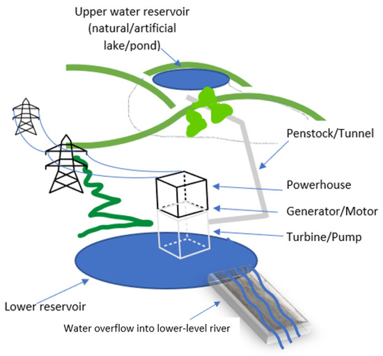 At sites where solar or wind energy systems are unsuitable, open- and closed-loop hydro energy systems might have their place to provide energy for industrial processes. In the United States, this technology is widely used, where creating closed-loop systems using pairs of existing or artificial lakes or reservoirs instead of rivers would avoid the need for new dams. There are currently projects underway, where in Bell County, Kentucky, for example, an old coal strip mine is being re-used [94]. As Wales in the UK has a vast array of those locations, it should be practical to install these. Figure 6 provides some details (not to scale) for the principles of this technology: