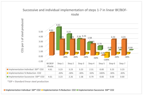 The individual seven steps towards “0” carbon steel production have a different effect, based on the way they are being implemented, either individually or in sequence (successive), as displayed in Table 2 and Figure 7: