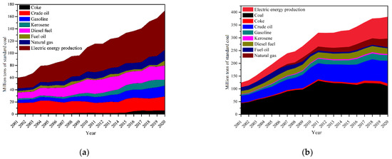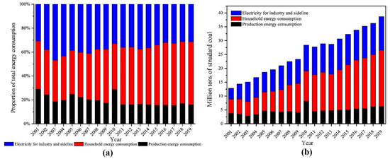 Energy consumption structure in the rural areas of Guangdong. (a) Energy consumption composition and proportion; (b) Energy consumption amount. From Guangdong Rural Statistical Yearbook (2002–2020) [13]; National Bureau of Statistics of China; China Energy Statistical Yearbook (2002–2020) [14].