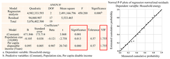 The regression results indicate that the regression equation fits well and is statistically significant and that household energy consumption in Guangdong can be expressed linearly in terms of rural population size and disposable income per capita: