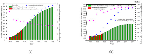 (a) Rural population size, rural per capita disposable income and household energy consumption forecast in Guangdong; (b) Total power of agricultural machinery, total output value of agriculture, forestry, livestock and fishery, and energy consumption for production forecast in Guangdong. From Guangdong Rural Statistical Yearbook (2001–2020) [13].